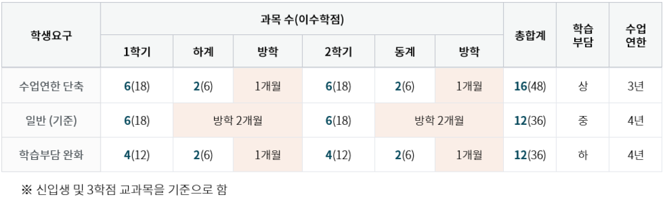 조기에 학위 취득을 원하는 분들은 일반학기와 집중학기를 모두 수강하면 신입생의 경우 최대 1년까지 수업연한을 단축할 수 있으며, 학습시간이 부족한 학생은 일반 학기의 수업량을 장학금을 지급받는 집중학기로 분산해 학습 부담을 최소화할 수 있어 과도한 수업 부담으로 인해 중도 포기하는 분들에게는 좋은 대안이 될 수 있습니다.
