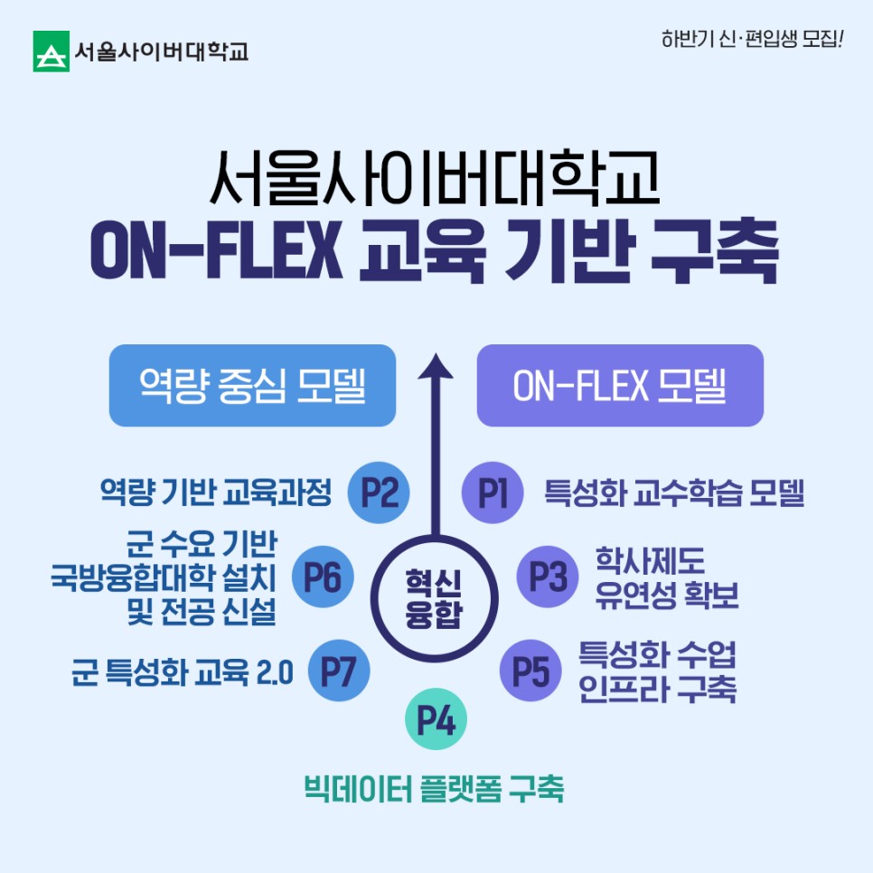 서울사이버대학교는 No.1 사이버대, 정규 4년제 사이버대, 신입학, 편입학, 8개 단과 대학(학부), 38개학과(전공) 운영, 대학교 인텔리전트 캠퍼스 보유, 1년 4학기제, 100% 사이버 강의, 오프대학1/3