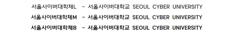 서울사이버대학교 전용서체는 Light, Medium, Bold 각 한글 11,172자, 영문 및 숫자 94자, 특수문자 986자로 구성되어 있습니다.