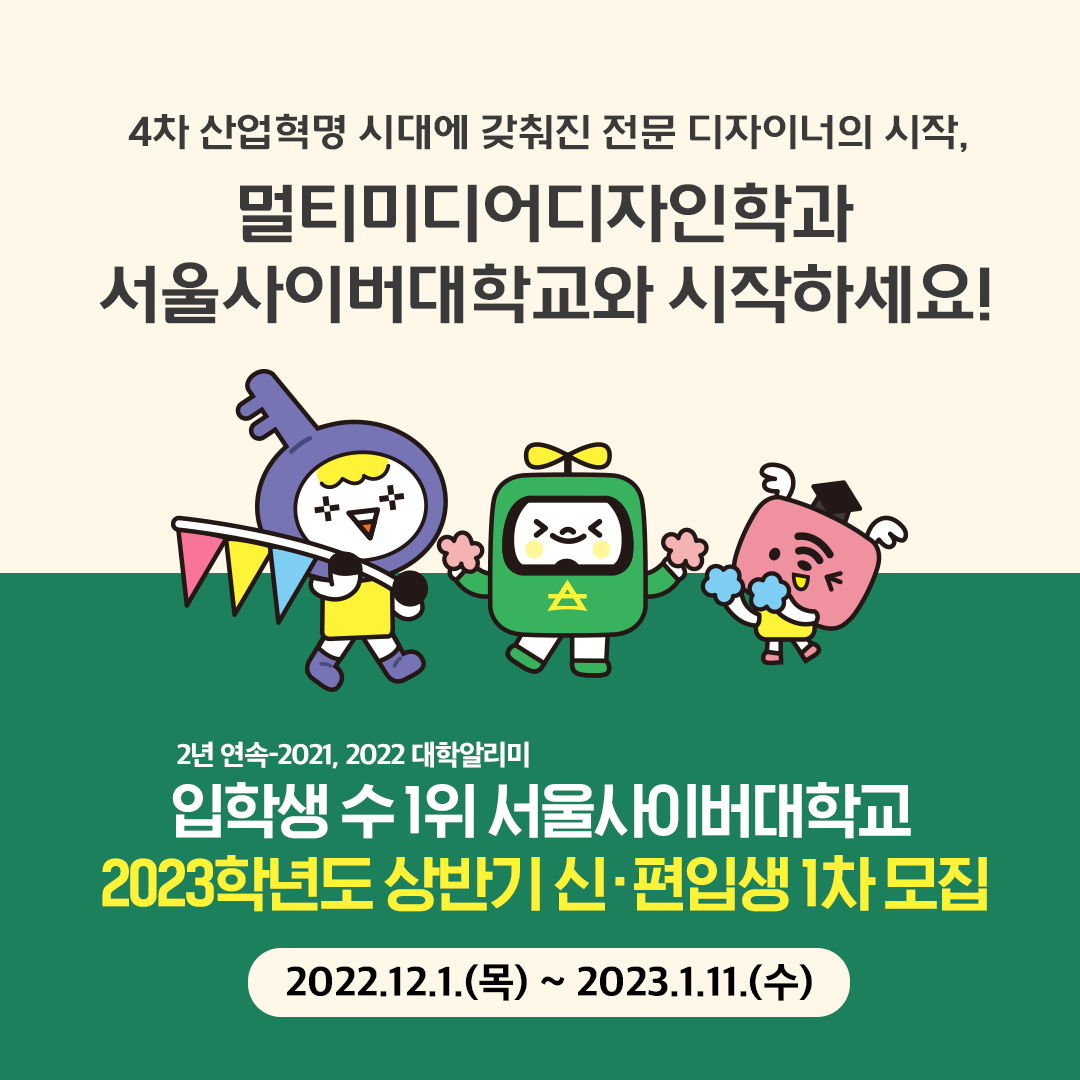 | NO.1 서울사이버대학교 2023학년도상반기 신·편입생 1차 모집 D-day 23 (0) | 2022.12.19 |