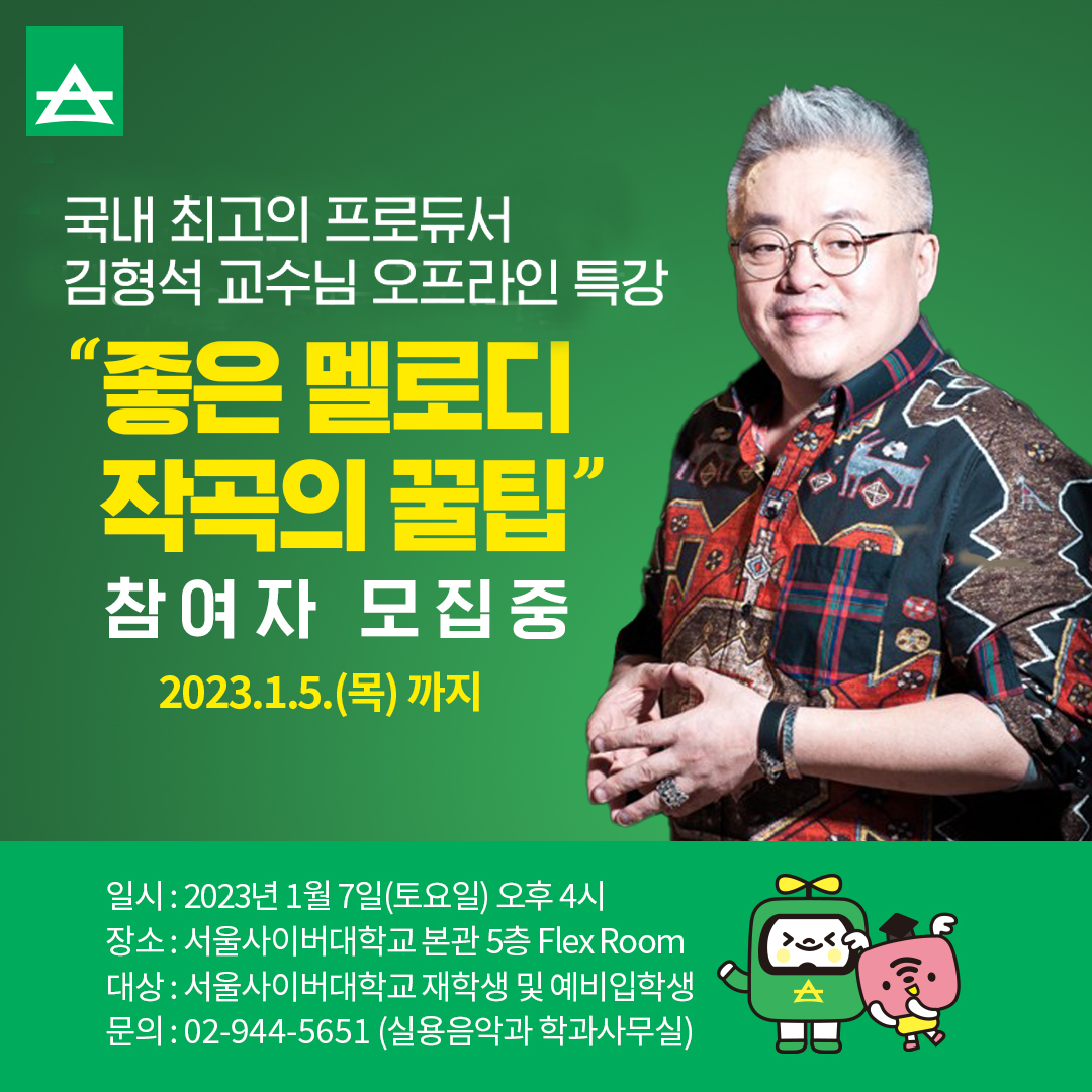 국내 최고의 프로듀서! 서울사이버대학교실용음악과 김형석 교수님 오프라인 특강 모집 본문