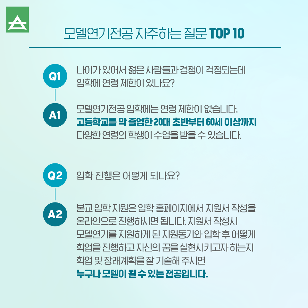 A1. 모델연기전공 입학에는 연령 제한이 없습니다.