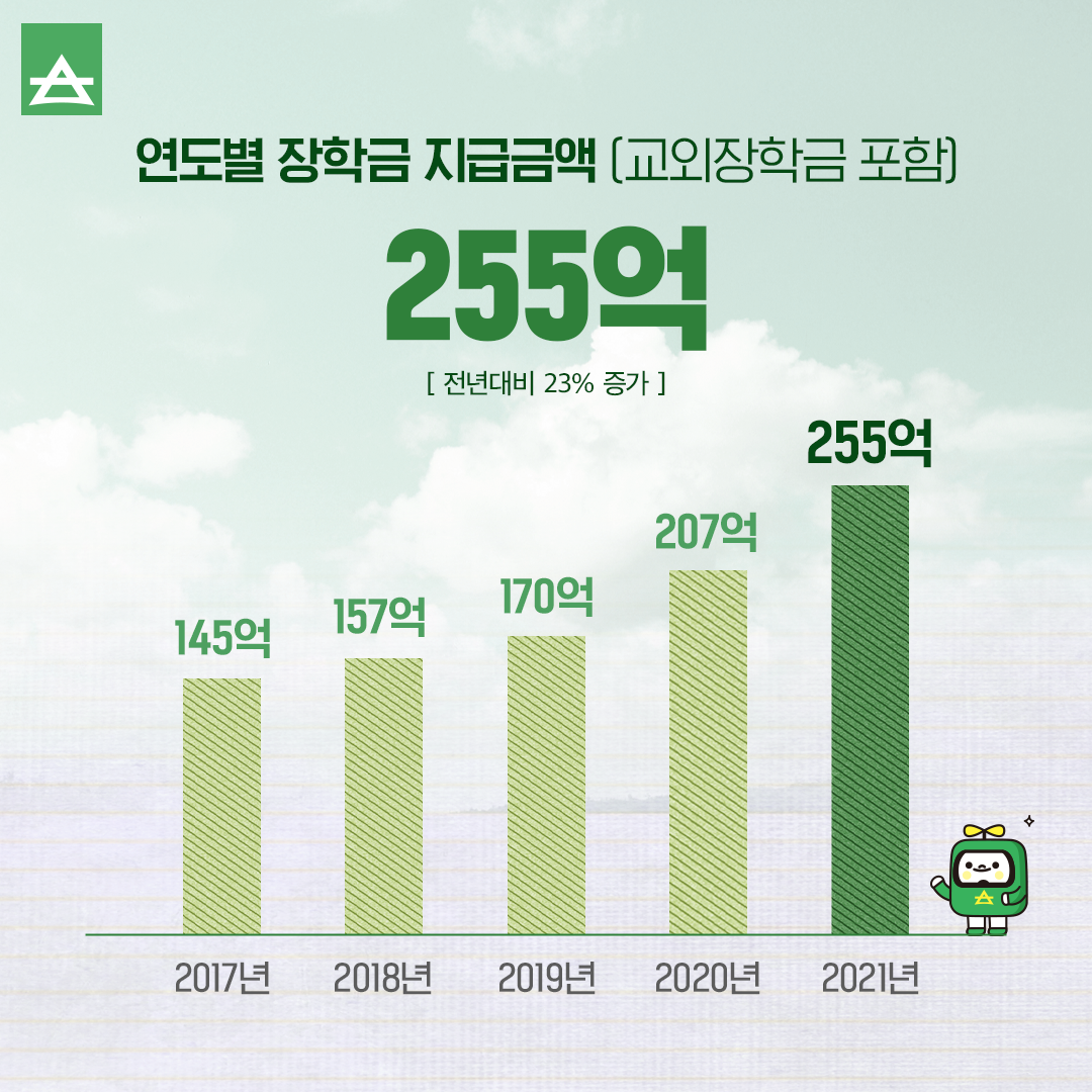 연도별 장학금 지급금액 255억으로