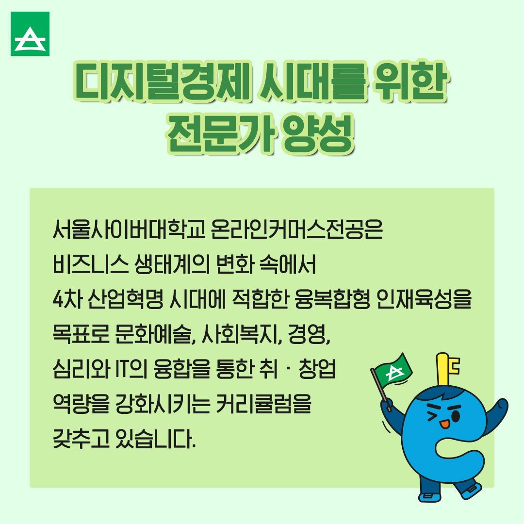 서울사이버대학교는 No.1 사이버대, 정규 4년제 사이버대, 신입학, 편입학, 9개 단과대학(학부), 41개학과(전공) 운영, 대학교 인텔리전트 캠퍼스 보유, 1년 4학기제, 100% 사이버 강의, 오프대학1/3 수