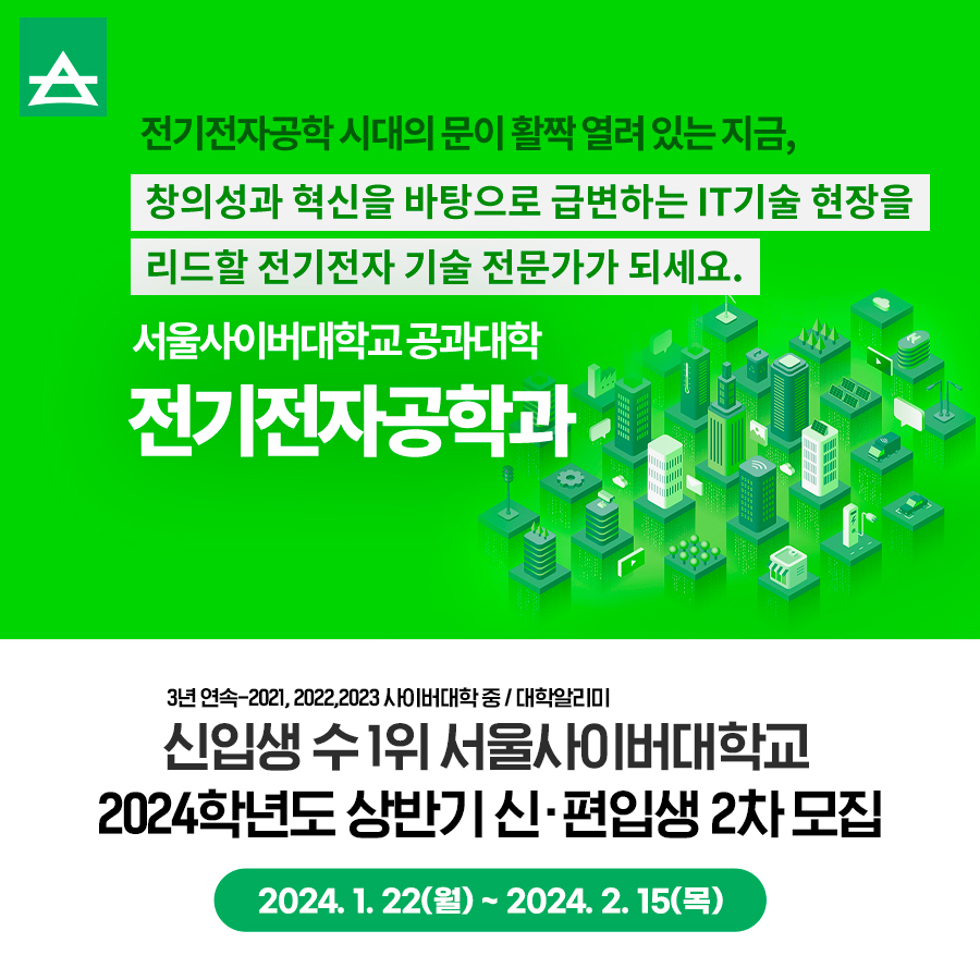 | NO.1 서울사이버대학교 2024학년도 상반기 신·편입생 모집마감 D-day31 (0) | 2023.12.11 |