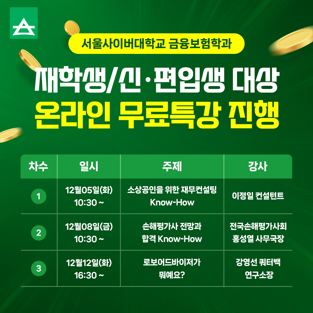 서울사이버대학교 금융보험학과 -재학생/ 신·편입생 대상온라인 무료특강 진행 본문