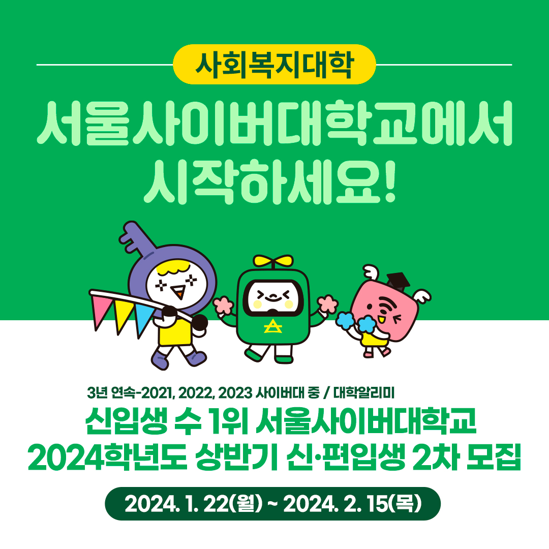| 사이버대학교입학 신입생이 3년 연속 가장 많은 서울사이버대, 복지경영전공 (0) | 2023.12.12 |