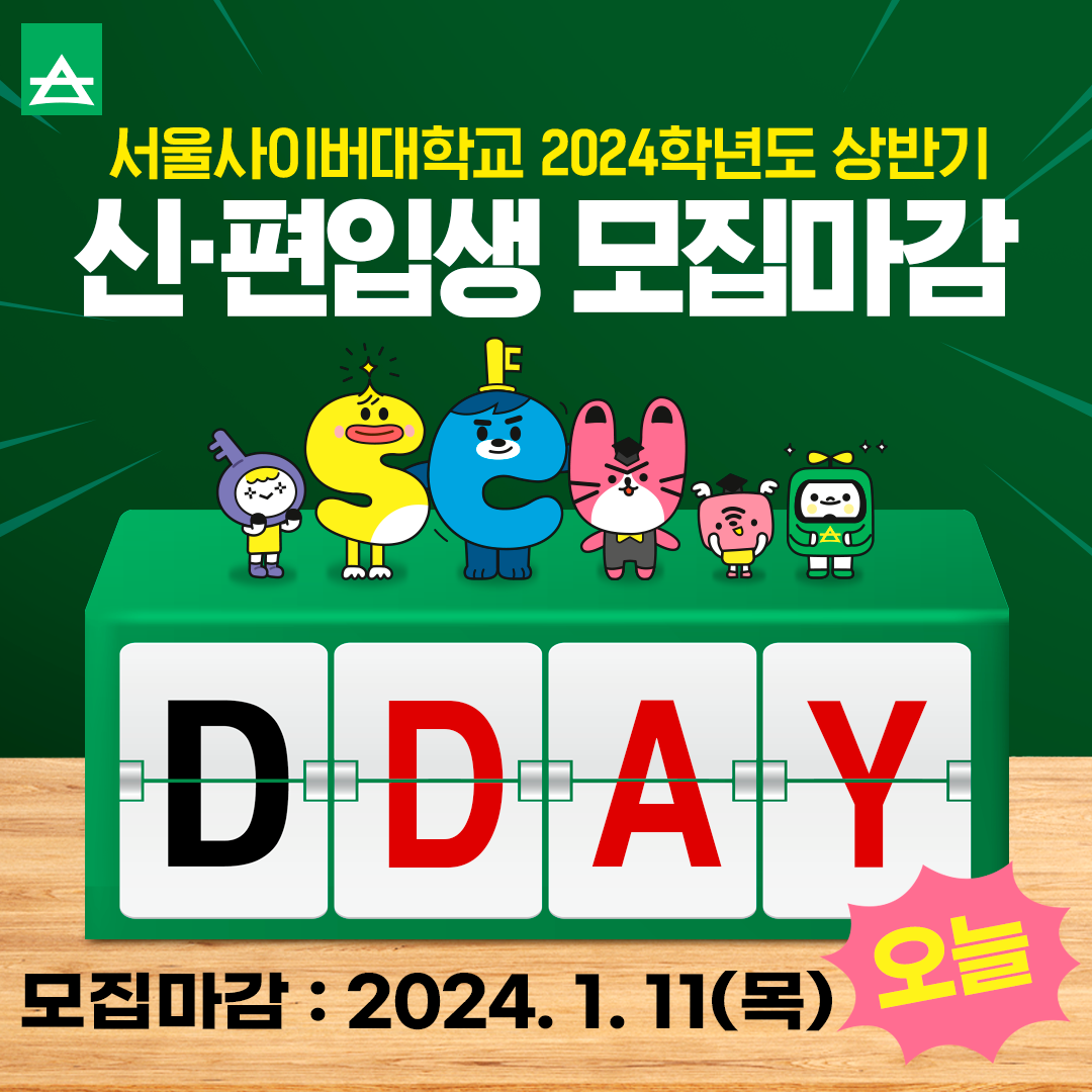 | NO.1 서울사이버대학교 2024학년도 상반기 신·편입생 모집마감 D-day3 (0) | 2024.01.08 |