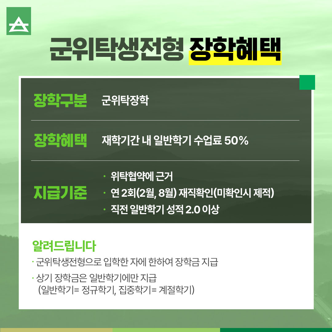 ㆍ군위탁생전형으로 입학한 자에 한하여 장학금 지급