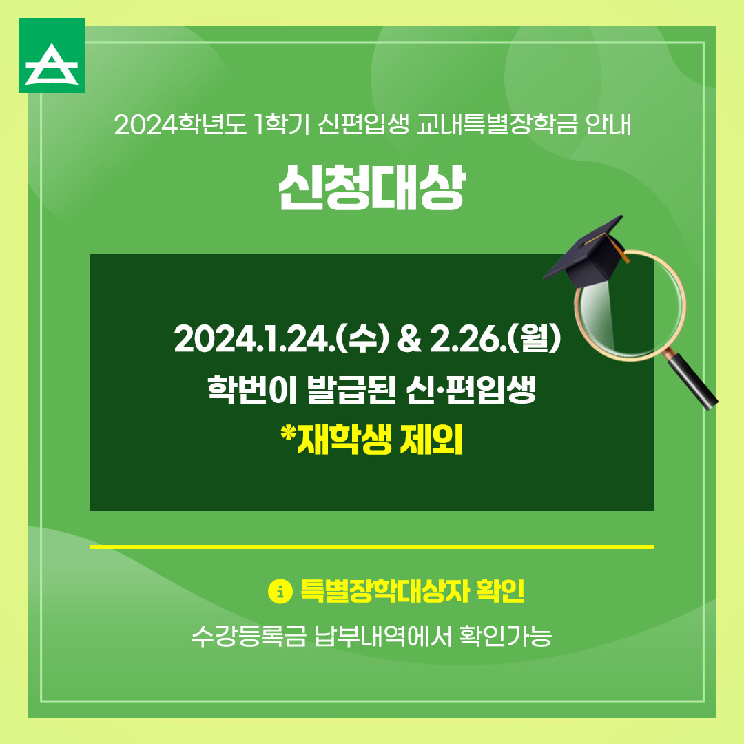 서울사이버대학교 2024학년도 1학기 2차 신편입생 교내특별장학금 안내✅ 본문
