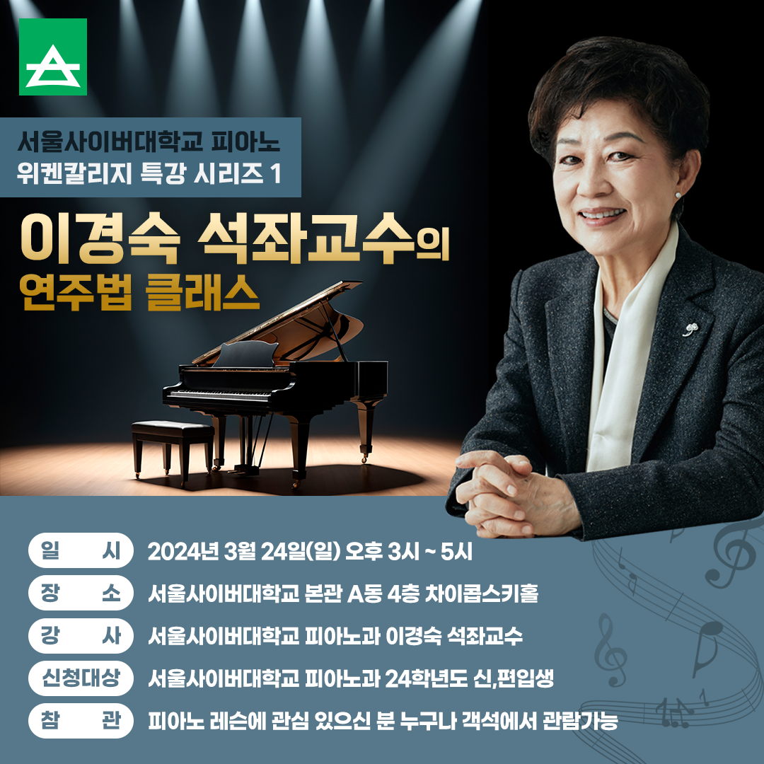 | 서울사이버대 피아노과 2024 Summer 위켄칼리지 이경숙 석좌교수 마스터클래스 (17) | 2024.06.26 |