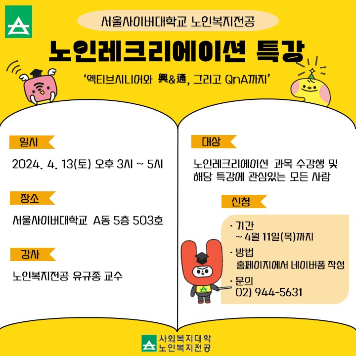 서울사이버대학교 노인복지전공 - 노인레크리에이션 오프라인 특강 본문