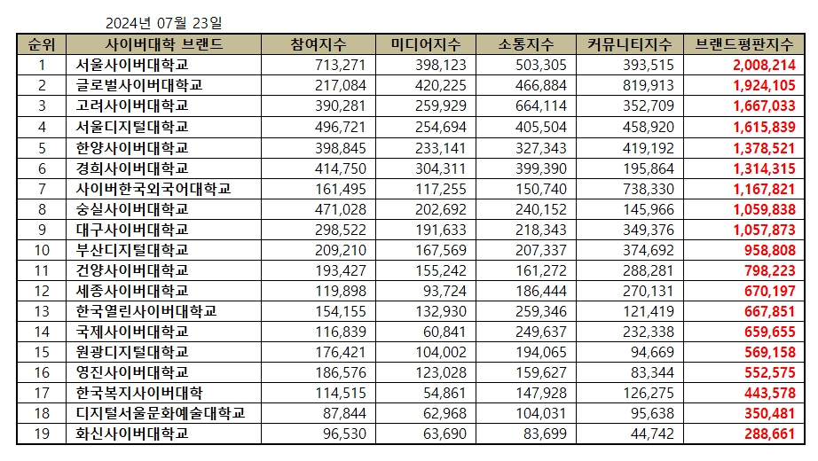 서울사이버대학교 7월 브랜드 평판 1위 관련한