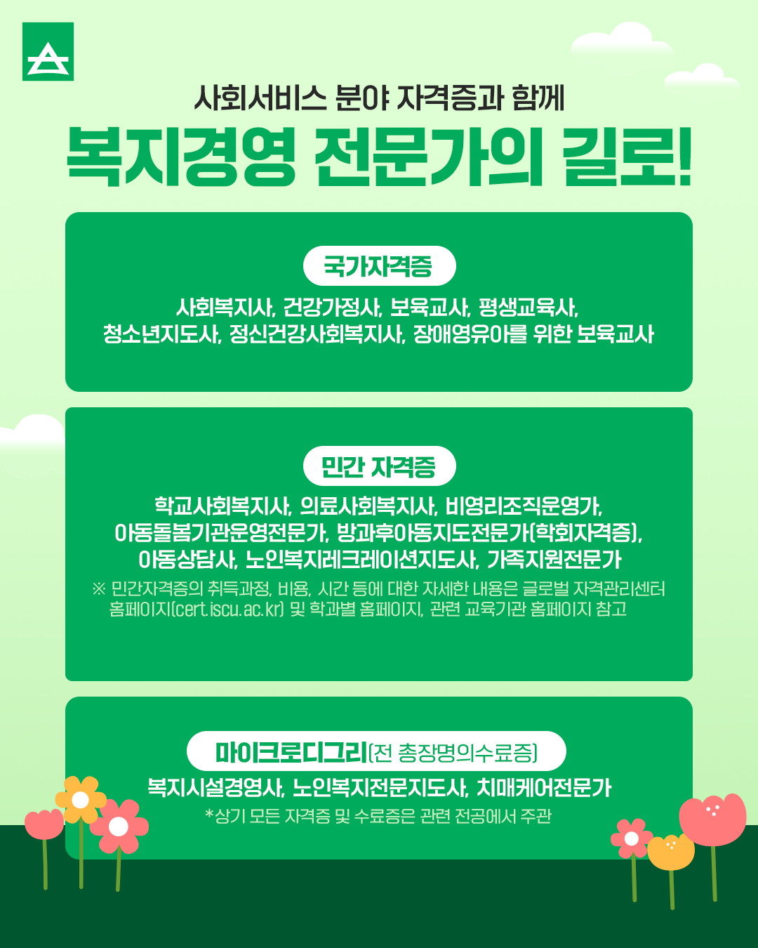 | 학교사회 복지사, 의료사회복지사, 비영리조직운영가, 아동돌봄기관운영전문가, 방과후아동지도전문가(학회자격증), 아동상담사, 노인복지레크레이션지도사, 가족지원전문가 *민간자격증의 취득과정, 비용, 시간 등에 대한 자세한 내용은 글로벌 자격관리센터 홈페이지(cert.iscu.ac.kr) 및 학과별 홈페이지, 관련 교육기관 홈페이지 참고 |