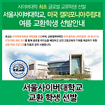 지난 6월 진행된 제1기 미국 캘리포니아주립대 여름 교환학생 선발 결과를 발표합니다. 서울사이버대학교는 사이버대 최초로 미국 캘리포니아 주립대 샌버나디노(CSUSB) 여름 교환 학생을 선발하였습니다. 해외연수를 통해 글로벌 리더십을 배양하고, 선진 교육을 경험할 수 있는 기회를 제공하고자 진행된 이번 교환 학생에 총 5명의 학생이 선발되었습니다. 선발된 학생은 캘리포니아 주립대 샌버나디노(CSUSB) 창업 지도자(Entrepreneurship) 과정과 캘리포니아 주 인근 기업 탐방 및 현장 체험 기회를 갖게 됩니다. 선발된 5분 모두 축하드립니다. 서울사이버대학교 2017학년도 2차 하반기 신·편입생 모집 인터넷 원서 접수 기간: 2017년 7월 19일 ~ 8월 17일까지 * 모집공고 보러 가기 : ht..